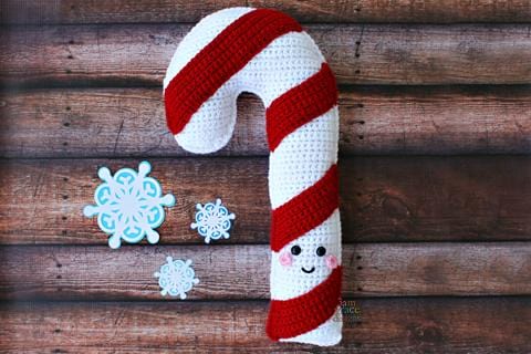 Our finished Candy Cane Kawaii Cuddler® is 16″ x 9". Hook size, yarn choice, and crochet tension will affect each individual result.
