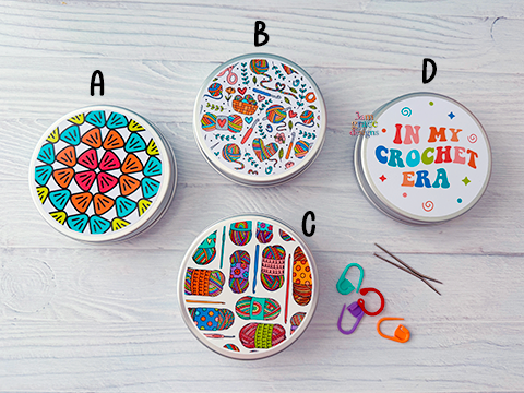 This tiny tin may look small, but it packs a mighty punch when it comes to keeping your stitch markers, tapestry needles, and/or safety eyes in line. No more digging through your purse or backpack for a rogue stitch marker – the crochet notions tin has got your back!