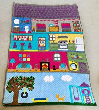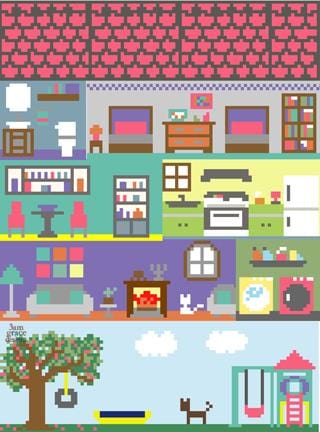This pattern contains both the charts and written instructions for 1 - 100 x 55 pixel top roof banner, 2 - 25 x 25 pixel room panels, 2 - 25 x 75 pixel room panels, 2 - 25 x 75 pixel room panels, 2 - 25 x 50 pixel room panels, and 1 - 25 x 100 pixel back yard bottom banner.
