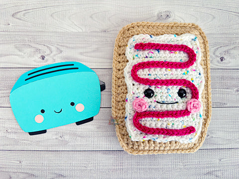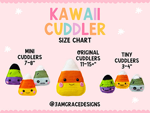 Our finished Mini Food Kawaii Cuddlers® are approximately 8" at their widest points. Hook size, yarn choice, and crochet tension will affect each individual result.