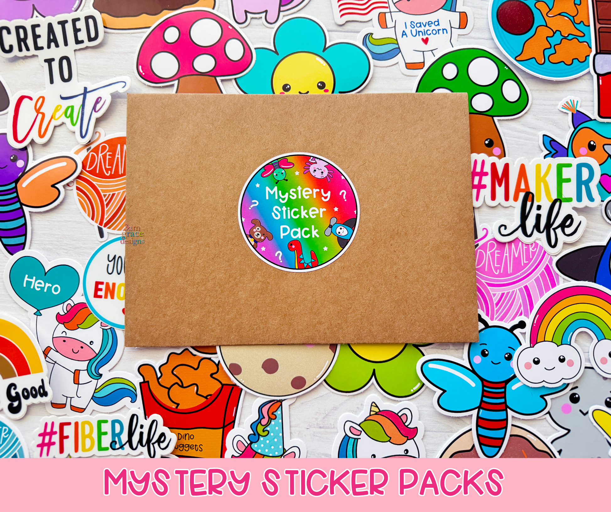 Our Mystery Grab Sticker Pack is packed with 12 adorable kawaii & maker/crochet-themed stickers—each one 3" in size and perfect for adding a touch of cuteness to your world!