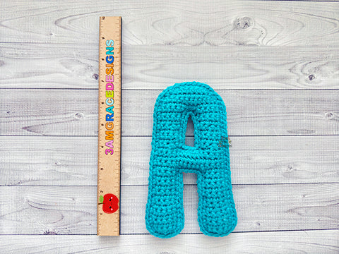 Our finished Mini Letter A Kawaii Cuddler® is 7″ x 4". Hook size, yarn choice, and crochet tension will affect each individual result.