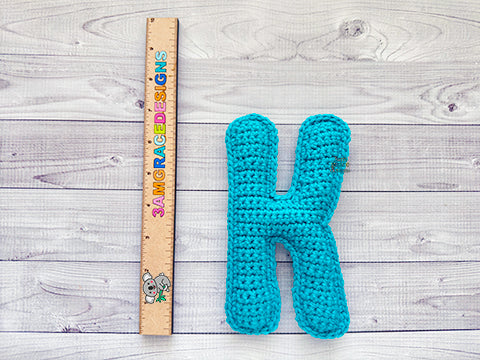 Our finished Mini Letter K Kawaii Cuddler® is 7″ x 4". Hook size, yarn choice, and crochet tension will affect each individual result.
