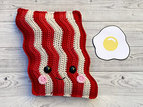 Our finished Bacon Kawaii Cuddler® is 9" x 12". Hook size, yarn choice, and crochet tension will affect each individual result.