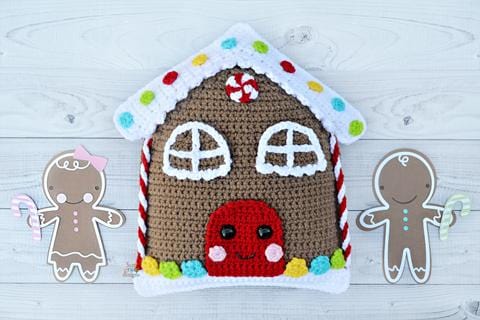 Our finished Gingerbread House Kawaii Cuddler® is 12″ x 12". Hook size, yarn choice, and crochet tension will affect each individual result.