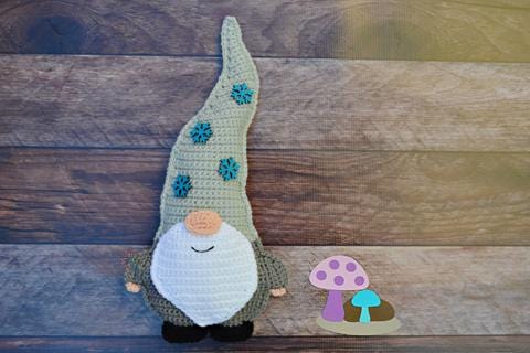 Our finished Gnome Kawaii Cuddler® is 16″ x 8". Hook size, yarn choice, and crochet tension will affect each individual result.