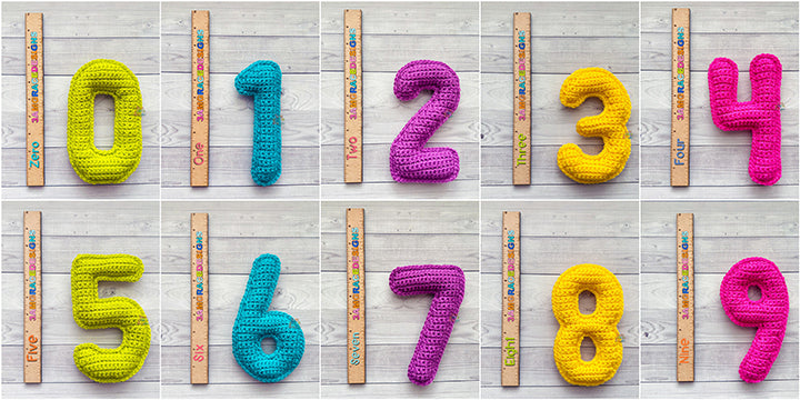 Our finished Number Kawaii Cuddlers® measures roughly 7″ tall. Hook size, yarn choice, and crochet tension will affect each individual result.